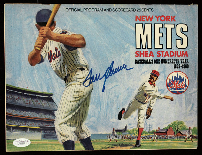 Description:Tom Seaver signed 1969 New York Mets program scored from July 9th near perfect game, JSA (EX). Seaver signed the front cover in blue marker. Signature rates 9/10 out of 10. Comes with COA from JSA (serial #ed sticker is affixed). Very neatly scored in blue ink from the July 9th game vs the Chicago Cubs in which Seaver pitched a 1-hitter, giving up the only hit with one out in the 9th inning. Seaver went on to complete the game, finishing with 11 K's and only allowing the one base runner. Displays minor handling wear, mainly along the spine: EX