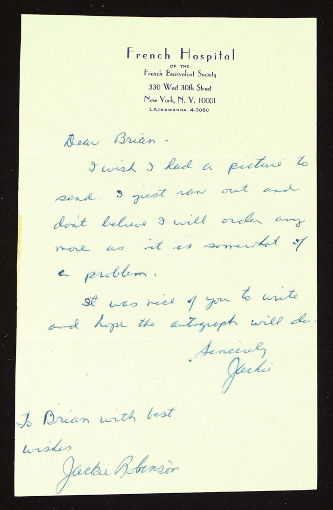 Description:Jackie Robinson handwritten letter signed twice "Hope the autograph will do" (Overall EX/MT). "French Hospital" stationary bears handwritten letter reading in part, "Dear Brian - I wish I had a picture to send. I just ran out+It was nice of you to write and hope the autograph will do. Sincerely, Jackie." Signed a second time below, "To Brian with best wishes Jackie Robinson." Ink signatures rate 8 to 9 out of 10 with a hint of light feathering. Paper has pair of light mailing folds, minute tape stain at left edge, and appears to have been very slightly trimmed: Overall EX/MT ($750-$1,000)