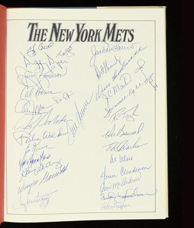 Description:1969 New York Mets (reunion) team signed hardcover book, JSA (NM). 1986 "The New York Mets" hardcover book signed on the half title page by (29) members of the 1969 World Series champion Mets including Yogi Berra, Rube Walker, Tom Seaver, Tug McGraw, Tommie Agee, Gary Gentry, Cleon Jones, Donn Clendenon, Cal Koonce, Don Cardwell, Jerry Koosman, and others. Signatures rate 8/9 to 10 out of 10. Comes with full LOA from JSA: NM