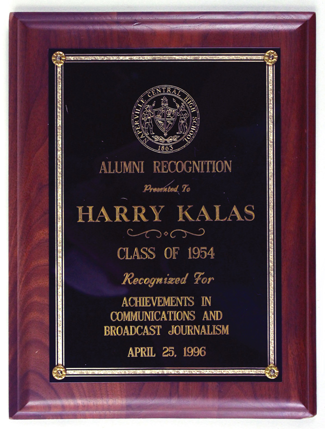 Description:Harry Kalas signed 1996 "Achievements in Communications and Broadcast Journalism" presentational plaque (EX-EX/MT, Sig. NM/MT). 9.25"x12.25" Wooden plaque having affixed metal placard on front with "Naperville Central High School" crest at top reading below "Alumni Recognition Presented to Harry Kalas, Class of 1954, Recognized for Achievements in Communications and Broadcast Journalism April 25, 1996." Light to moderate scattered wear to front. Back has been signed "Harry Kalas HOF 2002" in black marker rating 8/9 out of 10. Includes letter of provenance from the Kalas family: EX-EX/MT, Sig. NM/MT ($250-$500)