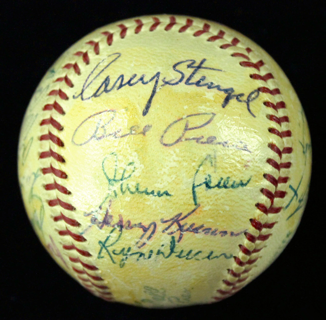 Description:1958 American League All-Star Team signed baseball (see description) (Ball EX-EX/MT, Sigs. EX-NM) Reach William Harridge Official American League baseball has been signed by (21) incl. Nelson Fox, Al Kaline, Jackie Jensen, Whitey Ford, Yogi Berra, Elston Howard, Casey Stengel, and others. Ted Williams is clubhouse signed and Mickey Mantle does not appear on the ball. Ink signatures rate 7 to 9 out of 10. Ball has period coat of shellac applied which has toned lightly and some consistent minimal surface wear throughout. League stampings remain bold and well defined. Includes auction LOA from JSA: Ball EX-EX/MT, Sigs. EX-NM ($300-$500)