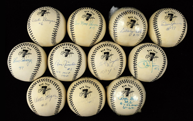 Description:Lot of (11) New York Yankees signed & inscribed Mickey Mantle commemorative baseballs (EX-EX/MT). Incl. Luis Arroyo with "47" inscription; Hank Bauer with "#9" inscription (fading); Clete Boyer with "#6" inscription; Bobby Cox with "#14" inscription; Ralph Houk with "#35" "WS Champs 61-62" inscriptions; Hector Lopez with "#11" inscription; Gil McDougald with "#12" "ROY 51" inscriptions; Bobby Murcer with "#17" inscription; Joe Pepitone with "25" inscription; Bobby Richardson with "#1" "WS MVP 1960" inscriptions; and Bill Moose Skowron with "#14" inscription. Signatures rate 5 (Bauer) to 9/10 (avg 8/9) out of 10. Most show various degrees of toning: EX-EX/MT