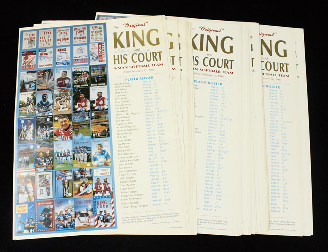 Description:Lot of approx. (50) 1992 King and His Court promotional posters with (13) signed (Posters VG-NM, Sigs. EX/MT-NM) Grouping of similar posters with 1992 copyright date. (13) Have been signed by Feigner in ink rating 7/8 to 9 out of 10. A portion of the posters (including signed) have varying degrees of toning and wear inclusive of corner/edge wear, minimal corner creasing, very minute isolated edge tears, and some horizontal light lines: Posters VG-NM, Sigs. EX/MT-NM