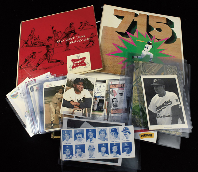 Description:Lot of assorted sports memorabilia, c.1940s-1990s (VG/EX-MT). Incl. c.1940s-50s Philadelphia Athletics pin (EX/MT-NM); c.1950s Milwaukee Braves pin (EX-EX/MT); c.1955 Dodgers NL Champions pin (EX); 1961 "Go Get 'Em, Braves" record (EX, album cover wear); (2) 1962 Braves Milwaukee County Stadium giant postcards (EX-EX/MT); 1974 Baltimore Orioles yearbook (EX/MT); c.1970s "Hank Aaron: The Life of a Legend" record (EX/MT); 1981 Donruss Golf set (NM-NM/MT); 1997 NBA Finals program (NM); and other items. Range: VG/EX-MT