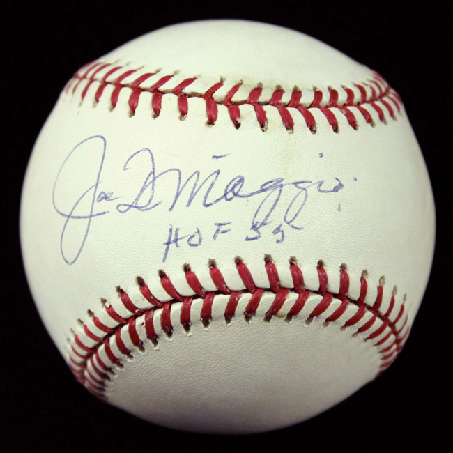 Description:Joe DiMaggio single signed baseball with HOF inscription (NM) Rawlings G.Budig Official American League baseball has been signed on the sweetspot, "Joe DiMaggio HOF 55." Blue ink signature rates 8/9 out of 10. Ball has the slightest hint of extremely light wear with small imperfection to League stampings: NM ($300-$500)