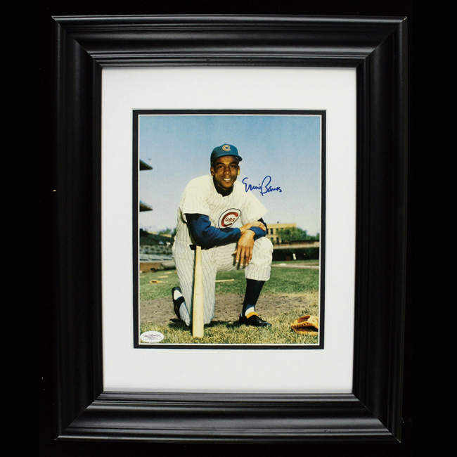 Description:Ernie Banks signed photograph, JSA (NM). 14.5"x17.5" framed photo signed by Banks in blue marker. Signature rates 9 out of 10. Comes with COA from JSA (serial #ed sticker is affixed). Due to framing, complete condition is unknown: NM appearance
