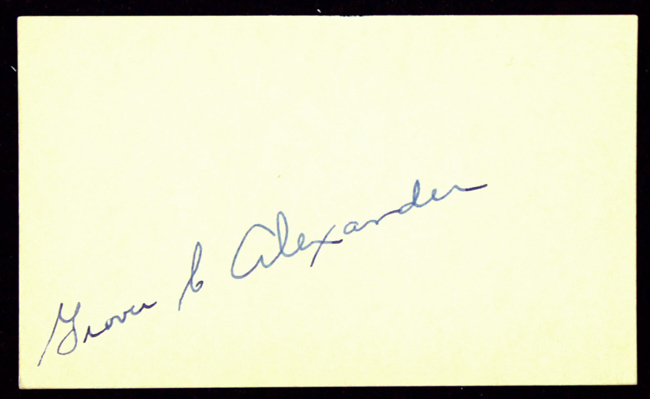 Description:Grover C. Alexander fountain pen signed 3"x5" index card c.1930s (NM-MT) Standard sized index card has been signed on the unlined side, "Grover C. Alexander." Vintage fountain pen signature rates 9-9/10 out of 10; card displays very mild even toning. Very fine example being one of the strongest we have handled: NM-MT ($2,000-$3,000)