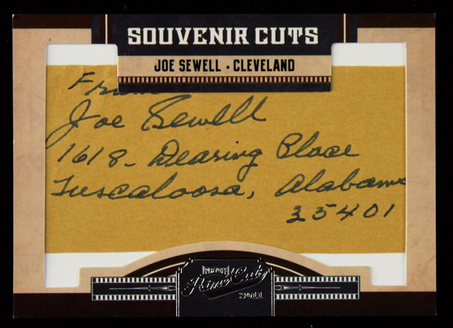 Description:2011 Playoff Prime Cuts "Souvenir Cuts" #33 Joe Sewell signed insert card (NM). Card contains Joe Sewell cut signature with portion of his return address. Signature rates 9/10 out of 10. Card is #ed 44/45: NM