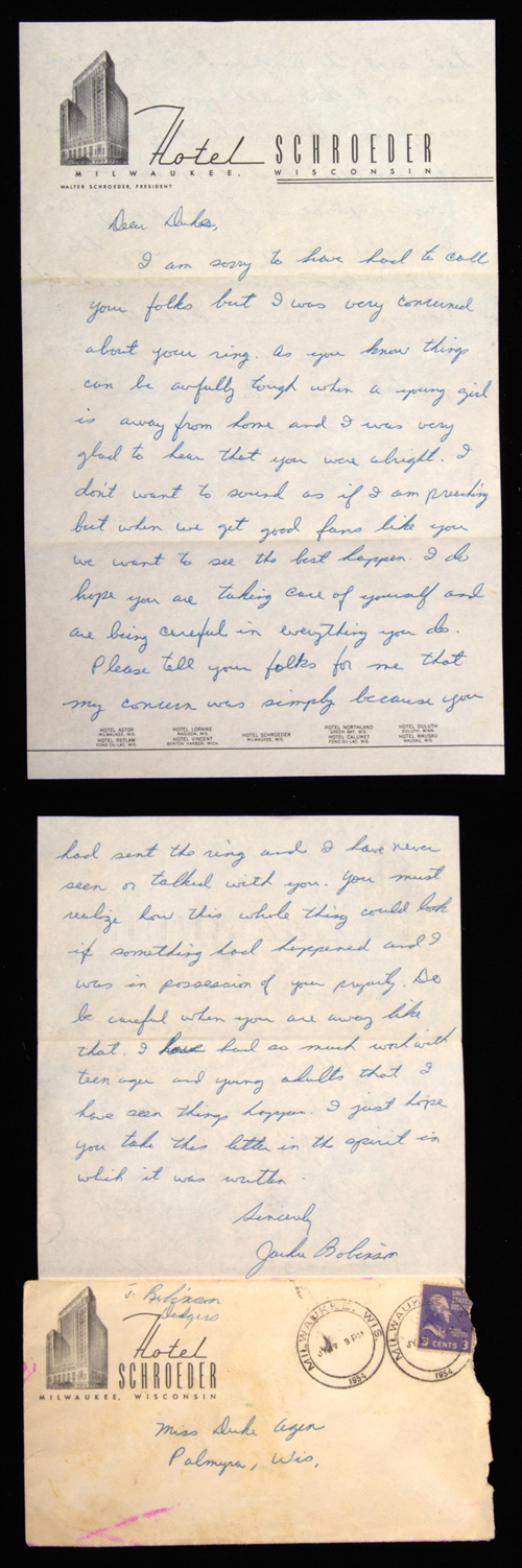 Description:1954 Jackie Robinson handwritten/signed letter with original (signed) mailing envelope (desirable and seldom offered playing days example) (Overall EX/MT) "Hotel Schroeder" stationery bearing handwritten letter from Jackie Robinson which covers the front and three quarters of back. It appears to have been written to a teenaged female fan who had sent Robinson a ring which he then returned to her parents. Reads in part, "+when we get good fans like you we want to see the best happen." Signed at the close, "Sincerely Jackie Robinson" in ink rating 8-8/9 out of 10. Letter has a touch of age toning and typical mailing folds. Includes original envelope which is addressed in his hand and is signed "J. Robinson Dodgers" at upper left. Envelope has a bit more toning, some other discoloration, and torn right edge. Postmarked July 17, 1954 from Milwaukee and the Dodgers had that day beaten the Braves with Robinson going 1 for 4: Overall EX/MT ($2,000-$3,000)