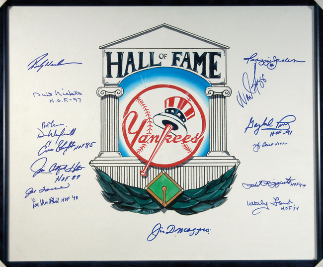 Description:"Yankees Hall of Fame" original painting signed by (15) incl. DiMaggio (NM-MT) Original painting on board featuring Yankees top hat logo at center with "Hall of Fame" titling above. Signed throughout by (15) former Yankees players, nearly all of whom have been Inducted into the Hall of Fame. Includes Joe DiMaggio, Ricky Henderson, Phil Niekro, Bob Lemon, Dave Winfield, Enos Slaughter, Catfish Hunter, Joe Torre, Lee MacPhail, Reggie Jackson, Wade Boggs, Gaylord Perry, Yogi Berra, Phil Rizzuto, and Whitey Ford. Marker signatures rate 8 to 9/10 out of 10 and around half have been inscribed with Hall of Fame Induction year. Framed for display and measures 24"x28" overall: NM-MT ($500-$750)