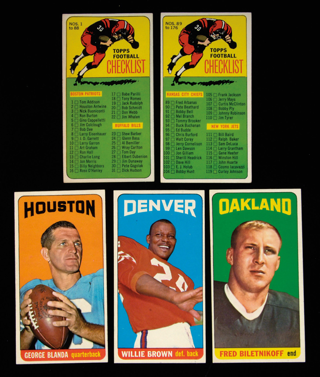 Description:1965 Topps football near complete set (175 of 176 cards) missing only Namath (Range GD to EX/MT-NM) Nice set missing only the Namath Rookie. Condition ranges from GD on up with very few cards at lower end. Average falls in VG/EX-EX range and there are a good number of EX, EX/MT, and a few better. Keys: #35 Kemp (GD/VG), 46 Brown (EX/MT-NM appearance from front, back has minute surface tear), 69 Blanda (VG/EX), 87 Checklist (VG-VG/EX unmarked), 99 Dawson (VG-VG/EX), 133 Biletnikoff (EX-EX/MT), 155 Alworth (VG/EX), and 176 Checklist (VG/EX-EX unmarked). Card #165 Lincoln is PSA graded (EX-MT+ 6.5): Range GD to EX/MT-NM ($750-$1,000)