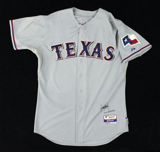Description:2009 Elvis Andrus signed game worn Texas Rangers jersey, MLB Authenticated (EX). Majestic MLB Authentic Collection "Cool Base" size 48 jersey with "TEXAS" sewn across the front, along with "ANDRUS" and number "1" sewn on the back. Texas state flag patch is sewn on the left sleeve. "SET 2 2009" tag is on interior along with wash tag. Andrus signed the jersey in black marker and added "Game Used 2009" inscription. Signature rates 8/9 out of 10. MLB Authenticated serial #LH722504 hologram sticker is affixed, and is in their database under Game-Used Jersey. Displays visible usage wear, with team repairs below the left shoulder and to the left of his name on the back, along with a small stain on the back: EX