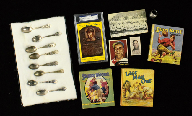 Description:Lot of assorted memorabilia including 1906 Chicago White Sox postcard (GD-NM). Incl. Suhling & Koehn 1906 Chicago White Sox team photo postcard (VG, handling wear, correspondence); 1910-11 Sporting Life M116 George McQuillan pastel (GD); 1936 "Stan Kent: Freshman Fullback" by William Heyliger (VG/EX); 1937 "Stan Kent: Captain" by William Heyliger (VG); 1937 "Last Man Out" by Harold Sherman (VG/EX); 1953 Topps #27 Roy Campanella (VG/EX); Yellow HOF plaque postcard signed by Duke Snider in blue marker rating 9 out of 10 (PSA/DNA); 1982 #1 Beckett Baseball Memorabilia and Autograph Price Guide (EX); Dallas Cowboys 1992 Super Bowl XXVII Champions commemorative ring by Balfour marked sterling (EX/MT); and (8) Spanish-American commemorative spoons mostly relating to George Dewey (VG/EX-EX/MT). Range: GD-NM
