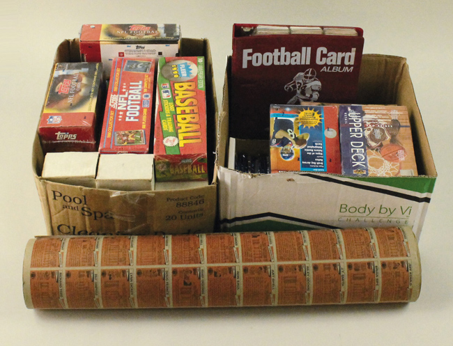 Description:Lot of assorted baseball, basketball, and football cards from 1981-2000s (GD-MT). Unopened baseball includes 1990 Fleer set, 1990 Upper Deck set, and 1992 Upper Deck high series wax box. Unopened basketball includes 1993-94 Upper Deck series 1 wax box. Unopened football includes 1990 Score set, 2002 Bowman wax box, (72) 2002 Bowman wax packs, and (2) 2003 Topps sets. Other cards include (2) 1981 Topps Football uncut sheets (VG/EX-EX overall, neither with Montana); 1986 Topps #161 Jerry Rice rookie (VG/EX); 1990 Score #257 Barry Sanders rookie (EX); and many others. Various conditions throughout the lot. Most appear to average NM overall. Range: GD-MT