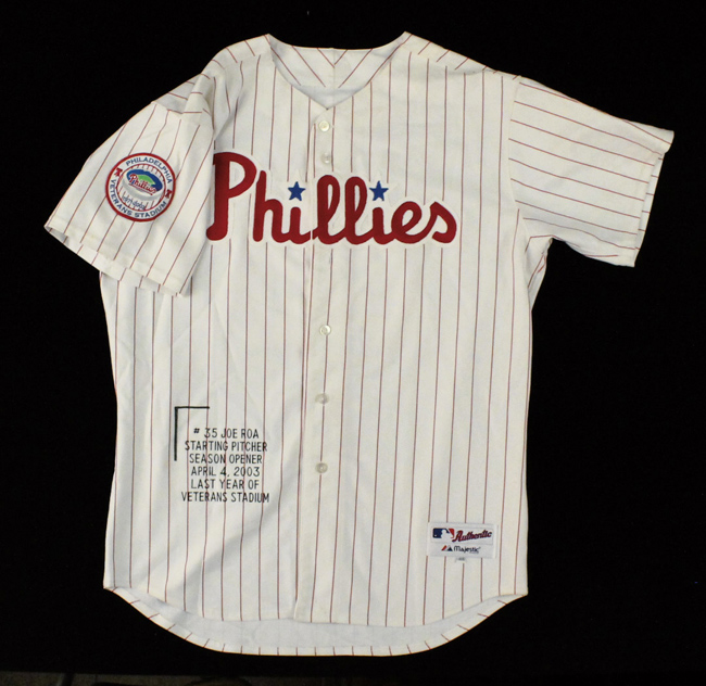 Description:2003 Joe Roa professional model Philadelphia Phillies jersey with Veterans Stadium final season patch (see description). Majestic MLB Authentic Collection size 48 jersey with "Phillies" sewn across the front, along with "ROA" and number "35" sewn on the back. Number "35" is also sewn on the left sleeve, and 1971-2003 Veterans Stadium patch is sewn on the left sleeve. Majestic tagging is sewn on the front tail with size "48" flag tag, and "0062" code is on interior wash tag. The jersey has been embroidered "#35 Joe Roa" "Starting Pitcher Season Opener April 4, 2003" "Last Year Of Veterans Stadium", implying that this is the jersey he wore during that game, but we are unable to confirm. Displays moderate usage wear with fabric pilling and minor staining: EX