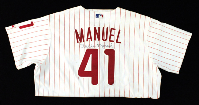 Description:Charlie Manuel signed Philadelphia Phillies professional model jersey, c.2005-06 (EX/MT). Majestic MLB Authentic Collection size 54 jersey with "Phillies" sewn across the front, along with "MANUEL" and number "41" sewn on the back. Number "41" is also sewn on the left sleeve. Majestic tagging is sewn on the front tail with size "54" flag tag, and "0062" code is on interior wash tag along with +2" body tag. Manuel signed the jersey in black marker. Signature rates 8 out of 10. Displays light to moderate usage/wash wear, with staining visible around the collar: EX/MT