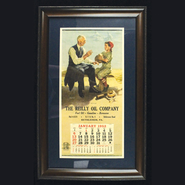 Description:1952 Connie Mack calendar featuring Bill Medcalf lithographic design (EX). Large format piece featuring Connie Mack "Play To Win" lithographic design by Bill Medcalf at the top, and 1952 calendar at the bottom. Housed in 19.5"x31", so complete condition is unknown, but minor edge wear and light creases are visible: EX appearance