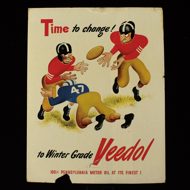 Description:Veedol motor oil vintage football themed advertising display c.1940s-50s (VG). 22"x28" cardboard stock advertising display with central football player action scene. Wear at top edge including a small tear and toning, with similar wear at upper right corner. Lower edge has chip and large tear, with some creasing. If framed for display only some damage would remain visible: VG