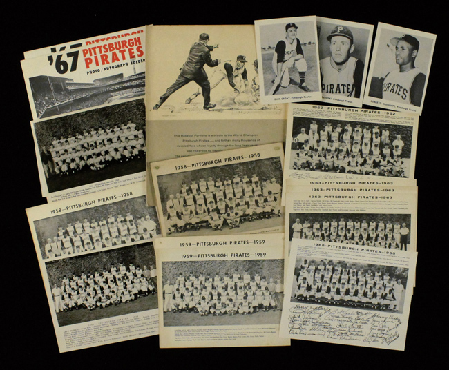 Description:Vintage Pittsburgh Pirates lot, c.1956-1971 (VG-NM). Incl. (14) Pirates team photos: 1956, (2) 1958, (3) 1959, 1962, (3) 1963, (2) 1965, 1966, and 1971 (VG-NM, avg EX-EX/MT); (12) c.1959-60 picture pack photos including Roberto Clemente, Bill Mazeroski, and others (EX/MT-NM); c.1960s "Beat 'Em, Bucs" bumper sticker (NM); Set of (6) 1961 Ford "Pittsburgh Pirates Prints" including Clemente, Mazeroski, Groat, Hoak, Friend, and Law (VG-EX/MT, avg EX due to age toning); and (2) 1967 Pirates team photograph folders (EX/MT-NM). Range: VG-NM