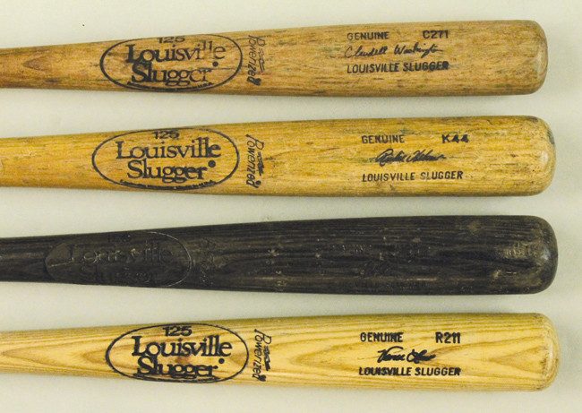 Description:Vance Law, Claudell Washington, Richie Hebner, Rick Rhoden professional model baseball bats (VG/EX-EX/MT). Includes c.1980-83 35" Louisville Slugger K44 Richie Hebner model bat (EX strong usage wear); c.1980-83 34.5" Louisville Slugger R211 Vance Law model bat (EX/MT rack marks); c.1980-83 34.5" Louisville Slugger K55 Rick Rhoden model bat (VG/EX, usage wear, trademark crack); and c.1980-83 34" Louisville Slugger C271 Claudell Washington model bat with "55 Sosa" written on the knob (EX, strong usage wear). Range: VG/EX-EX/MT