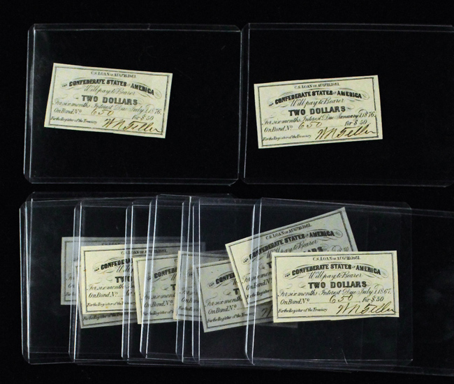 Description:Lot of (10) Confederate States Of America 2-dollar currency notes from 1867-1880 (VG-NM). Years include 1867, 1870, 1873, 1874, (2) 1876, 1877, (2) 1879, and 1880. Most appear to grade EX/MT overall with minimal handling wear. Range: VG-NM