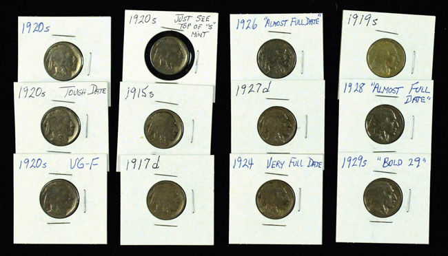 Description:Lot of (52) Buffalo Nickels from 1913-1938 (GD-EX/MT). Years include 1913 type 1, 1913 type 2, 1915, 1915S, 1917D, 1918D, (2) 1919S, 1920, 1920D, (5) 1920S, 1923, (3) 1923S, 1924, (3) 1925S, 1926, 1926D, 1927, (2) 1927D, 1927S, 1928, 1928S, (2) 1929, (6) 1929D, (4) 1929S, (2) 1930, (2) 1934D, 1935D, (2) 1935S, 1936D, and 1938. Various conditions throughout the lot. Most appear to grade VG-VG/EX overall with typical age and handling wear from circulation. Range: GD-EX/MT