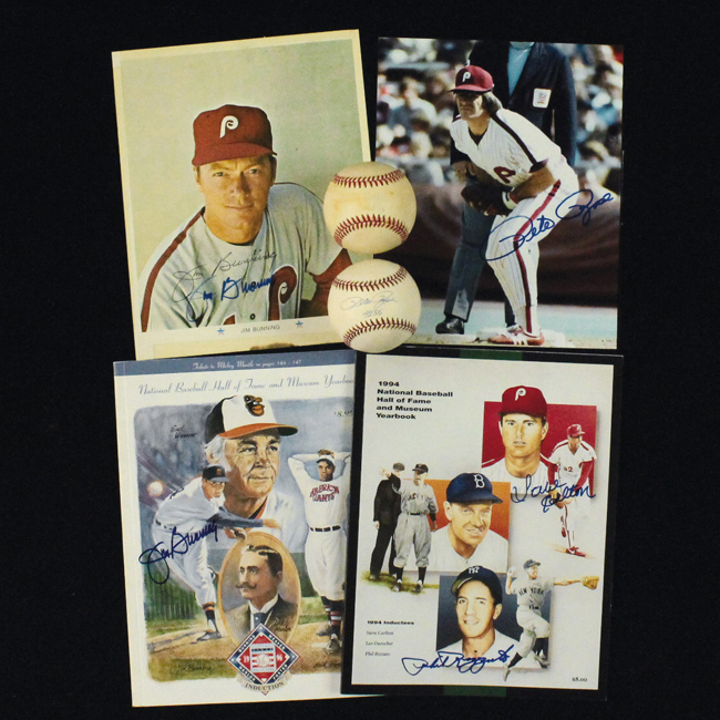 Description:Baseball stars and HOFers autograph lot, mostly Philadelphia Phillies, JSA (VG/EX-NM). Incl. L.Coleman NL ball (toned) signed by Steve Carlton (faded); B.Selig ML ball signed by Pete Rose with "4256" hit total inscription; 1971 ARCO photo signed by Jim Bunning (tape residue on edges); 8"x10" photo signed by Pete Rose; 1994 HOF yearbook signed by both Phil Rizzuto and Steve Carlton (back cover damage, signed front cover appears NM); and 1996 HOF yearbook signed by Jim Bunning. Signatures rate 3 (Carlton ball) to 10 (avg 8/9) out of 10. All come with COA from JSA (serial #ed sticker is affixed to each): VG/EX-NM