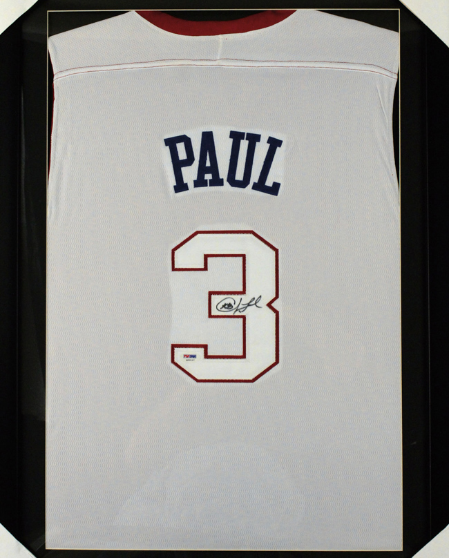 Description:Chris Paul signed Los Angeles Clippers jersey, PSA/DNA (NM). Clippers #3 Chris Paul jersey signed by Paul in black marker. Signature rates 8/9 out of 10. Comes with COA from PSA/DNA (serial #ed sticker is affixed). Housed in 22"x31" frame, so complete condition and aspects of the jersey are unknown, but appears to be high quality with letters and numbers sewn on: NM appearance