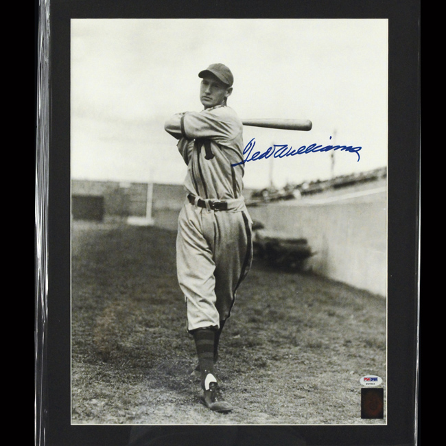 Description:Ted Williams signed large format photograph, PSA/DNA (NM). 20"x24" framed photo signed by Williams in blue marker. Signature rates 9/10 out of 10. Comes with COA from PSA/DNA (Williams Green Diamond and PSA/DNA stickers are affixed). Due to framing, complete condition is unknown: NM appearance