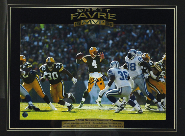 Description:Brett Favre signed large format "MVP" photograph, Favre authenticated (NM). 23.5"x29" framed 1996 MVP photo signed by Favre in black marker. Signature rates 9/10 out of 10. Brett Favre serial #ed hologram sticker is affixed. Due to framing, complete condition is unknown: NM appearance