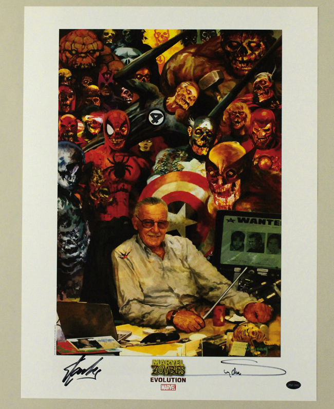 Description:Stan Lee signed Marvel Zombies lithograph also signed by artist Arthur Suydam, PSA/DNA (NM). 18"x24" lithograph signed by Lee in black marker. Signature rates 9 out of 10. Also signed by artist Arthur Suydam. Comes with COA from PSA/DNA (serial #ed hologram sticker is affixed): NM