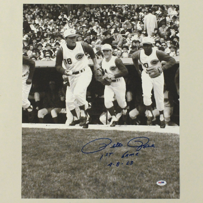 Description:Pete Rose signed and inscribed 1st Game 16"x20" photograph, PSA/DNA (NM). Rose signed the photo in blue marker and added "1st Game" "4-8-63" inscription. Signature rates 9/10 out of 10. Comes with COA from PSA/DNA (serial #ed sticker is affixed): NM