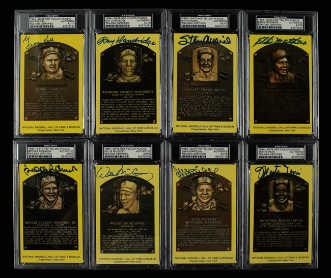 Description:Lot of (8) signed yellow HOF plaque postcards, PSA/DNA (NM-NM/MT). Incl. Stan Musial, Ray Dandridge, George Kell, Eddie Mathews, Monte Irvin, Juan Marichal, Willie McCovey, and Brooks Robinson. Signatures rate 8 (Mathews) to 10 out of 10. All are encased within PSA/DNA Authentic holders: NM-NM/MT