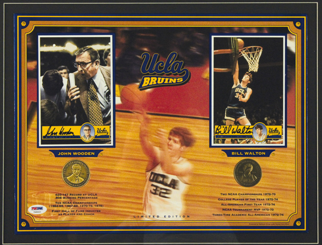 Description:John Wooden and Bill Walton dual-signed framed display, PSA/DNA (NM). 19"x23" framed display signed by both Wooden and Walton in black marker. Signatures rate 9 to 10 out of 10. Comes with COA from PSA/DNA (serial #ed sticker is affixed). Due to framing, complete conditions are unknown: NM appearance