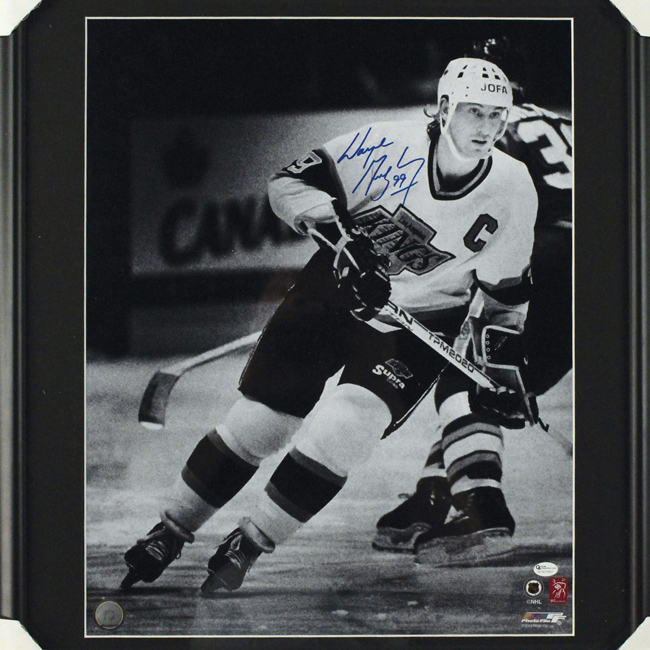 Description:Wayne Gretzky signed large format photograph (NM). 21"x25" framed photo signed by Gretzky in blue marker. Signature rates 9/10 out of 10. Online Authentics serial #ed sticker is affixed. Due to framing, complete condition is unknown: NM appearance