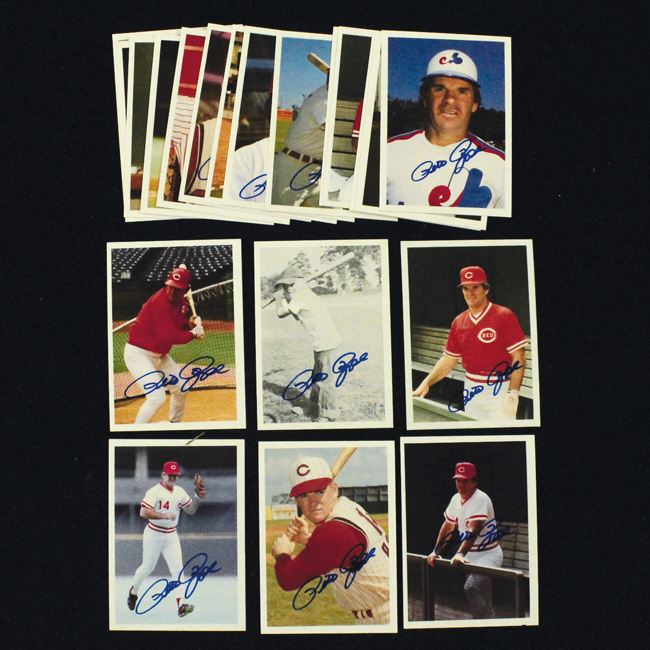 Description:Lot of (20) Pete Rose signed baseball cards (NM-NM/MT). Incl. (20) 1985 Topps "Pete Rose Enterprises" baseball cards each signed by Rose in blue felt tip ink. Signatures rate 8/9 to 10 out of 10: NM-NM/MT