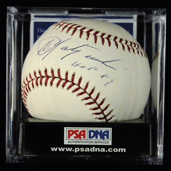 Description:Carl Yastrzemski signed and inscribed B.Selig MLB baseball graded PSA/DNA 9 (MT). Yastrzemski signed the sweet spot in black ink and added "HOF 89" inscription. Comes with COA from PSA/DNA which states that they have graded the autograph 9, and the ball 9, for an overall grade of 9 out of 10. Matching serial #ed sticker is affixed to ball: MT
