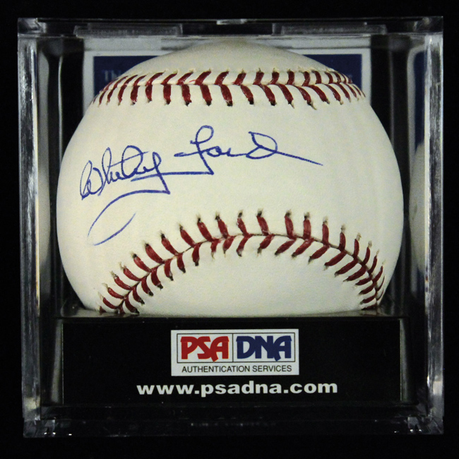 Description:Whitey Ford signed B.Selig MLB baseball graded PSA/DNA 9.5 (MT). Ford signed the sweet spot in blue ink. Comes with COA from PSA/DNA which states that they have graded the autograph 9, and the ball 10, for an overall grade of 9.5 out of 10. Matching serial #ed sticker is affixed to ball: MT