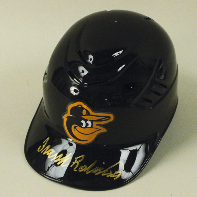 Description:Frank Robinson signed Baltimore Orioles replica model batting helmet, PSA/DNA (NM). Rawlings size 7 Orioles helmet with number "20" decal stickers on the back. Robinson signed the helmet in gold marker. Signature rates 9 out of 10. Comes with COA from PSA/DNA (serial #ed sticker is affixed): NM