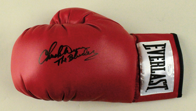 Description:Chuck Wepner signed and inscribed boxing glove, JSA (NM). Everlast boxing glove signed by Wepner in black marker with "The Bleeder" inscription. Signature rates 9 out of 10. Comes with COA from JSA (serial #ed sticker is affixed): NM