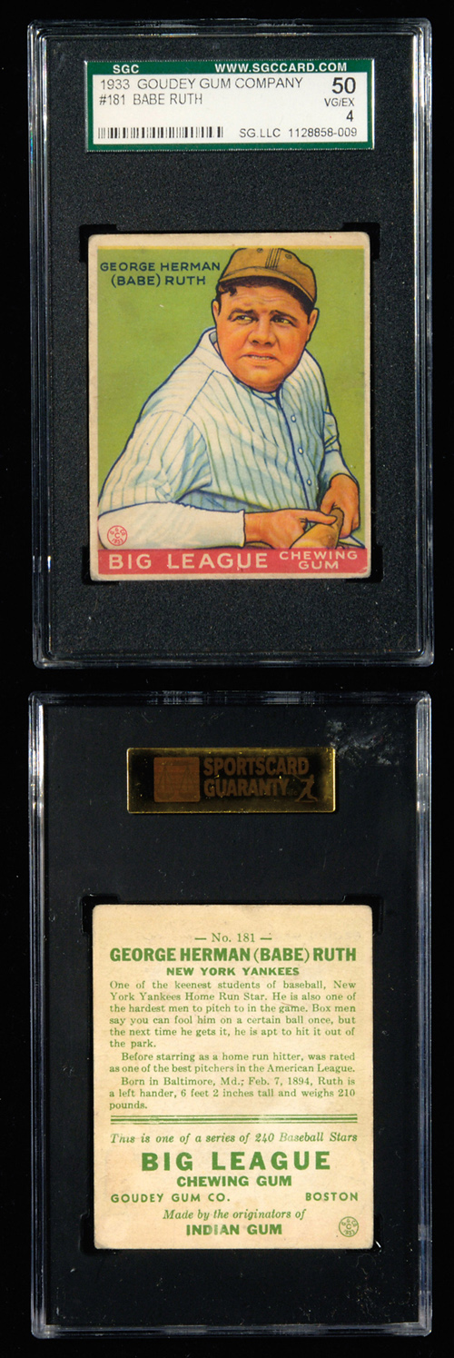 Description:1933 Goudey #181 Babe Ruth (SGC 50 VG/EX) Card displays a strong vibrant front graphic with light wear and centering which favors the lower edge: SGC 50 VG/EX ($2,000-$3,000)