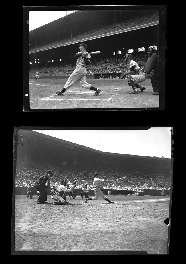 Description:Joe DiMaggio at bat c.1930s-40s, acetate negative (EX/MT) Vintage photographic negative having little to no evident wear shows the classic DiMaggio cut. Approx. 3.25"x4.5" and 4"x5". Includes letter of provenance from the Brearley family: EX/MT