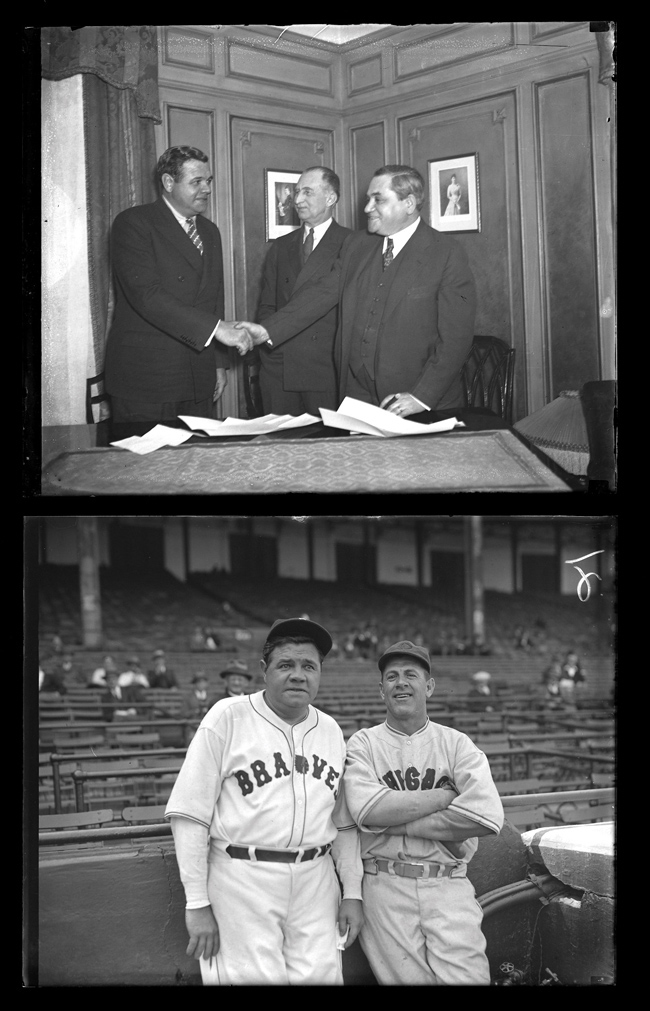 Description:Babe Ruth and the Boston Braves c.1935, lot of (4) glass plate negatives (EX-EX/MT) Vintage photographic negatives with Ruth shown in uniform in (1) and the remaining (3) taken on the day of his contract signing (shown in formal attire). Touch of light/typical wear (slightly more accentuated in one case) largely confined to extreme edges with little effect on central image portion. Approx. 4"x5". Includes letter of provenance from the Brearley Family: EX-EX/MT