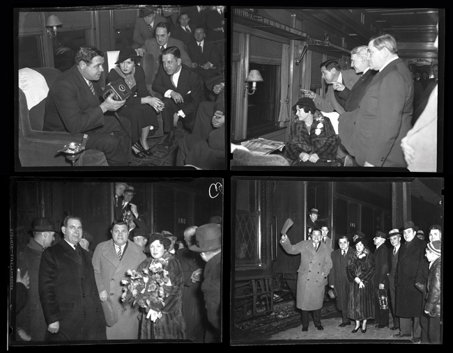 Description:Babe Ruth en route to and arriving in Boston in 1935, lot of (8) acetate negatives (EX-EX/MT) Vintage photographic negatives show Ruth on the train to Boston and just after his arrival. Additional shot (total of 9 in the lot) shows Mrs. Ruth reading his fan mail. Touch of light/typical wear largely confined to extreme edges with little to no effect on central image portion. Approx. 4"x5". Includes letter of provenance from the Brearley Family: EX-EX/MT