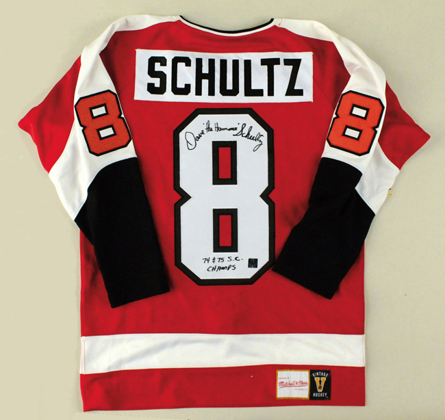 Description:Dave "The Hammer" Schultz signed & inscribed Mitchell & Ness throwback Philadelphia Flyers jersey (NM). Mitchell & Ness "Vintage Hockey" size 44 Flyers #8 Dave Schultz jersey signed by Schultz in black marker with "74 & 75 S.C. Champs" inscription. Signature rates 8/9 out of 10. Comes with letter of provenance from Dave Schultz: NM