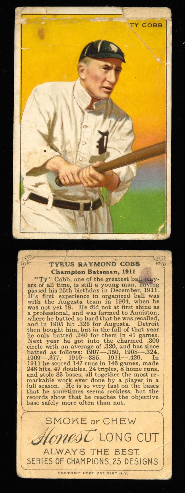 Description:1912 T227 Series of Champions Ty Cobb (see description) Desirable key card retains vivid coloration and thus sharp visual appeal despite noted condition flaws to include corner creases, horizontal crease at top edge with area of surface loss above (effects upper right corner), and other light/moderate wear. Small spot of discoloration on back: see description ($750-$1,000)