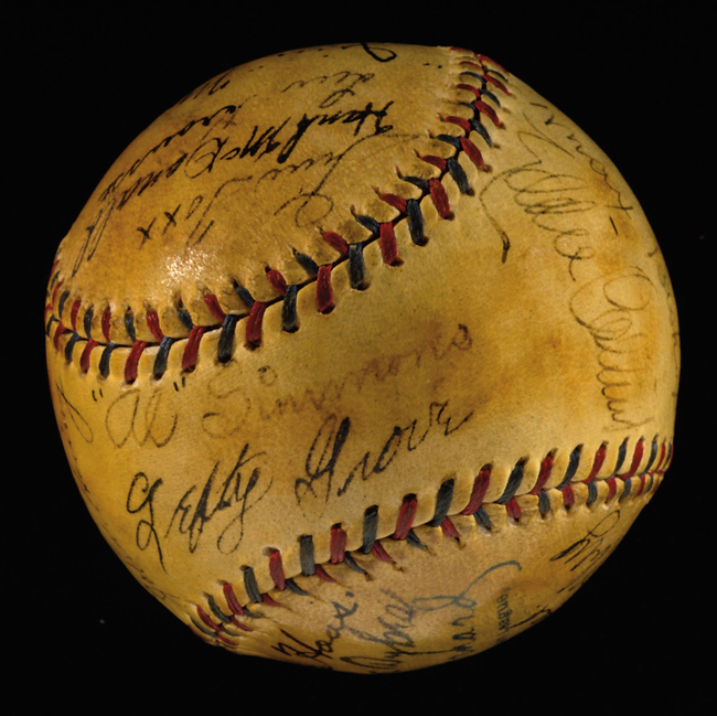 Description:1930 Philadelphia Athletics team signed baseball (World Series Champions) (Ball VG/EX-EX, Sigs. VG/EX-NM) Red and blue stitched Reach E.S. Barnard Official American League baseball has been signed by (19) incl. Jimmie Foxx, Lefty Grove, Connie Mack, Eric McNair, Bing Miller, Max Bishop, Jimmie Dykes, Rube Walberg, Mule Haas, Ed Rommel, George Earnshaw, Joe Boley, and others. In addition, there is a stamped signature from Mickey Cochrane and clubhouse signatures of Al Simmons and Bill Shores. Period fountain pen signatures rate 6-8/9 out of 10, avg. 7-7/8. Ball displays mild toning with light coat of shellac applied. Includes full LOA from JSA: Ball VG/EX-EX, Sigs. VG/EX-NM ($1,000-$2,000)