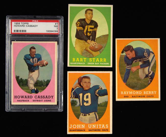 Description:1958 Topps football near complete set (131 of 132 cards) (Range VG to EX/MT-NM, Avg. EX or better) Nice set with many EX or better cards and only a few falling as low as VG. Missing only #62 Jim Brown. Keys: #1 Filipski (EX/MT OC), 2 Layne (EX/MT OC), 7 Cassady (PSA NM 7), 10 Moore (EX-EX/MT), 22 Unitas (EX), 31 Carmichael (PSA EX-MT 6), 32 Dillon (PSA EX-MT 6), 52 Groza (EX), 66 Starr (EX-EX/MT slightly OC), 73 Gifford (EX-EX/MT), 86 Tittle (EX/MT), 90 Jurgenson (EX/MT), 94 Rote (PSA EX-MT 6), 106 Donovan (EX/MT), 109 Eagles (PSA EX-MT 6), 120 Berry (EX/MT): Range VG to EX/MT-NM ($400-$600)