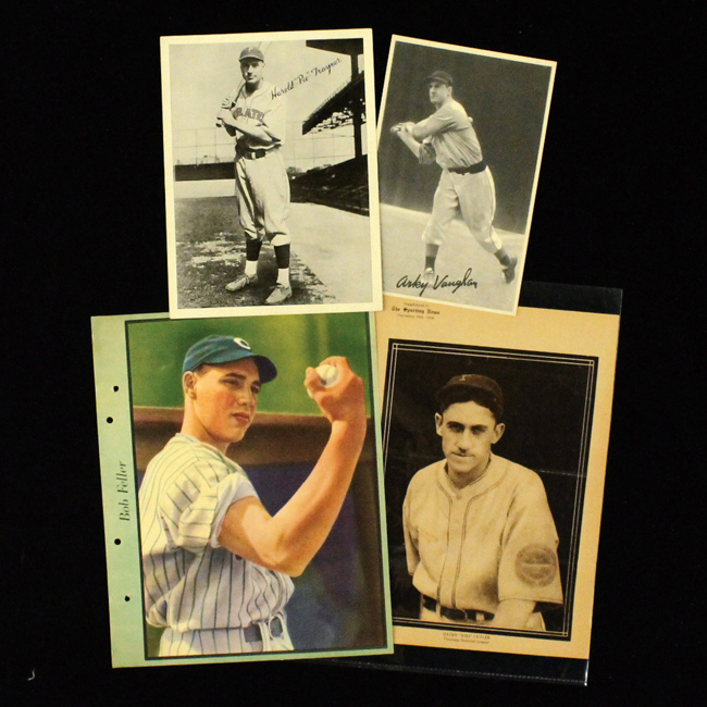 Description:Kiki Cuyler, Bob Feller, Pie Traynor, Arky Vaughan premium / supplement baseball cards from 1926-1939 (VG-EX/MT). Incl. Kiki Cuyler 1926 Sporting News supplement (VG); Pie Traynor 1936 R311 Glossy Finish (front appears EX/MT-NM, but back has a minor spot of paper loss); Bob Feller 1938 Dixie Lids premium (EX-EX/MT overall); and Arky Vaughan 1939 R303-B Goudey premium (EX/MT). Range: VG-EX/MT