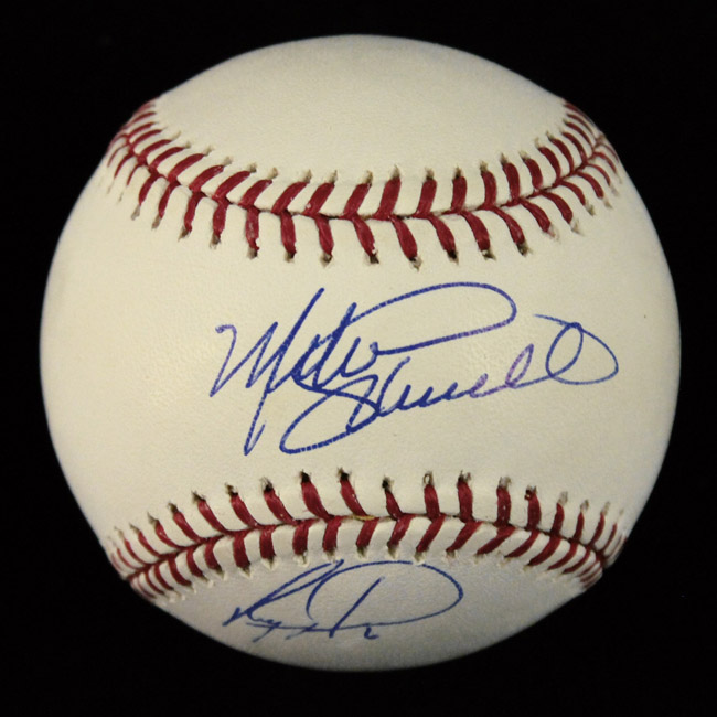 Description:Mike Schmidt and Ryan Howard dual-signed B.Selig ML baseball (NM/MT). Schmidt and Howard both signed the ball in blue ink. Signatures rate 9 to 10 out of 10: NM/MT